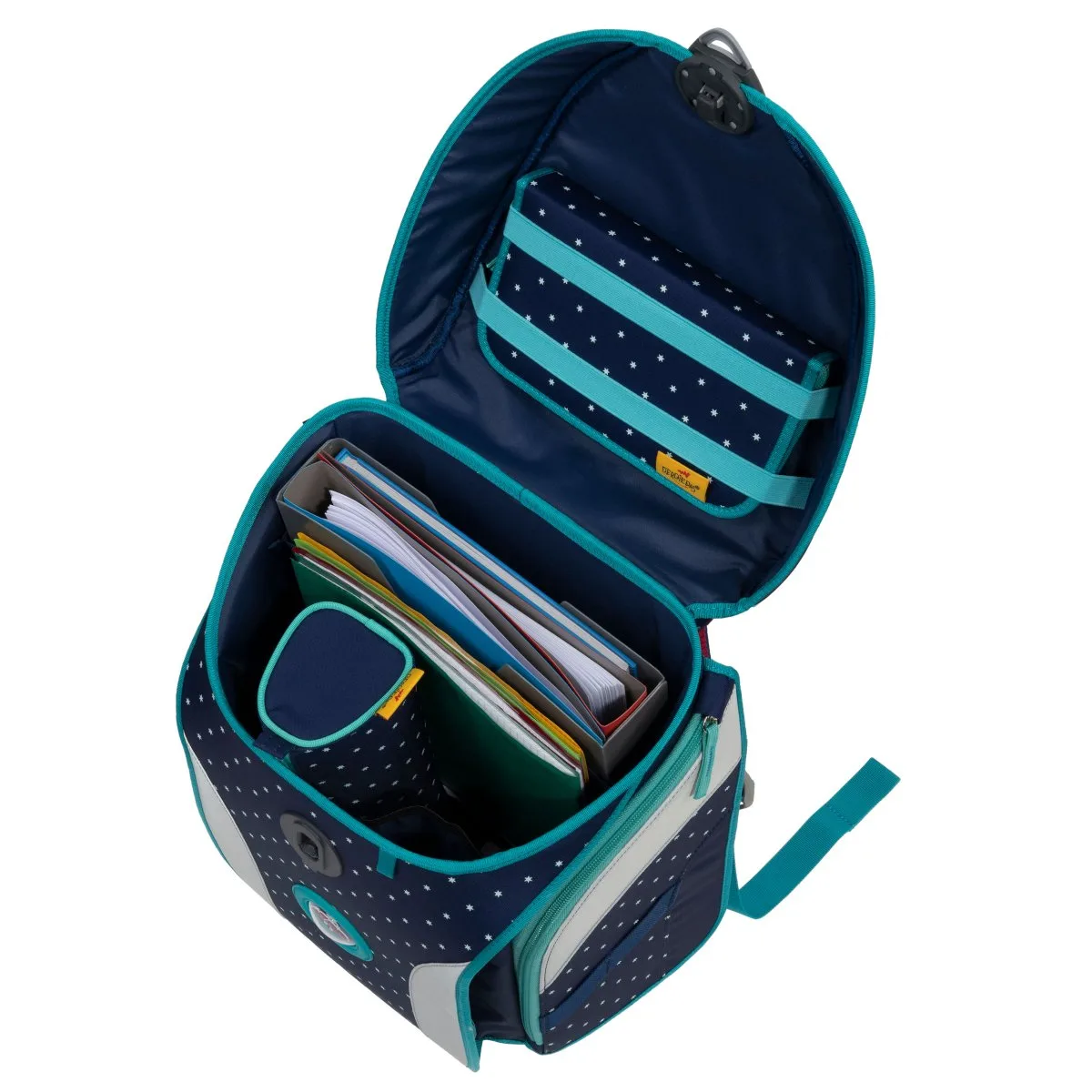 Trotz seiner Größe wiegt er gerade einmal 950 Gramm und bietet dennoch alles, was Kinder brauchen, damit der Schulstart gelingt. Dank seines cleveren Tragegurtsystems wächst er mit und entlastet den Kinderrücken. Die großen reflektierenden Flächen sorgen für einen sicheren Schulweg. Das Beste aber ist: Der ErgoFlex MAX Blue Speed kommt im praktischen Komplett-Set mit Heftebox, Sporttasche, Faulenzermäppchen, einem befüllten Schüleretui (Staedtler Qualitätsstifte) und 3 Wechselbuttons. So macht Schule Spaß! Der Stoff und das Futter sind aus