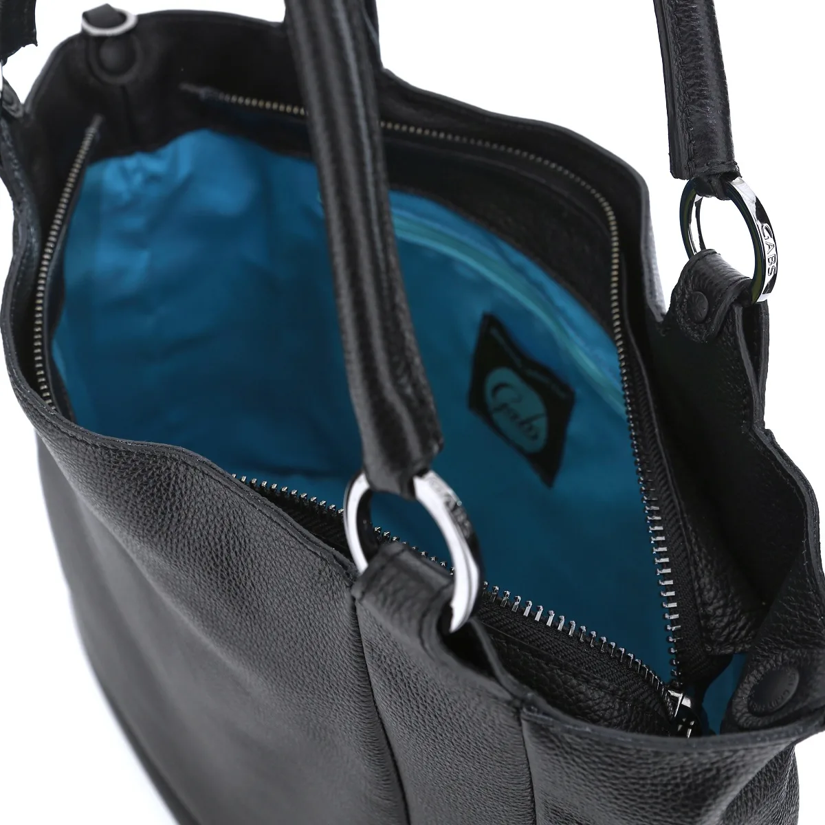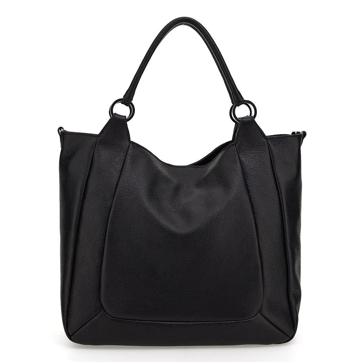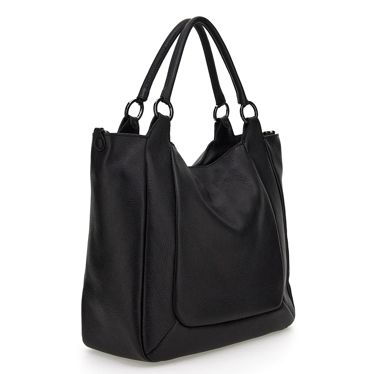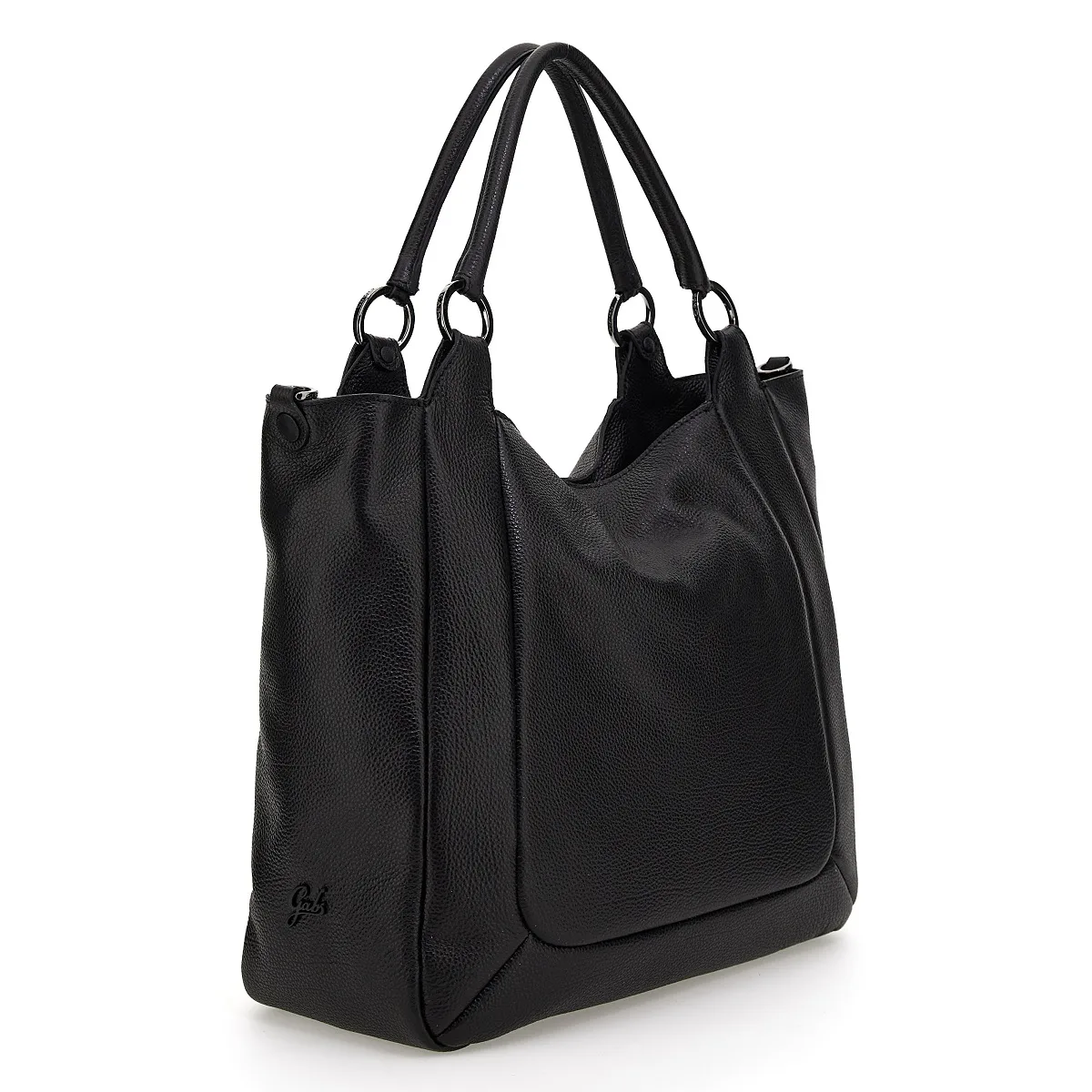 Shopper SANEM mit flachem Boden, Metallfüßen und verstellbaren und abnehmbaren Schulterriemen. Die Linie Black besticht erneut durch schwarze Knöpfe und Nähte und die klassischen Materialien, nämlich weiches „Ruga“- Leder.