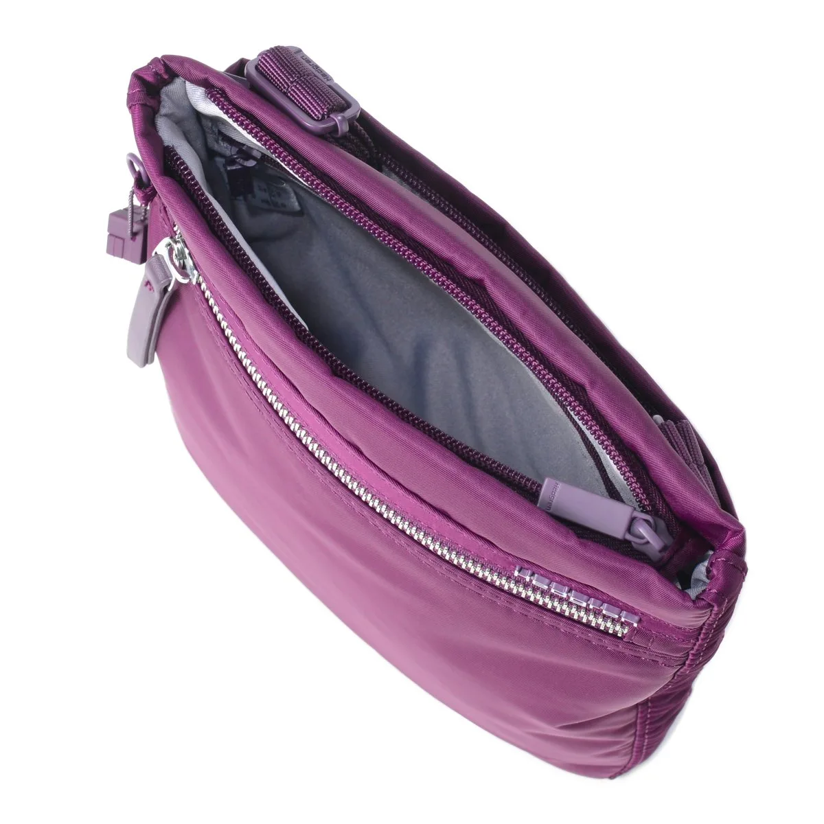 Hauptfach mit einem Reißverschlussfach, verstecktes Reißverschlussfach mit Stiftschlaufen und einer offenen Sliptasche.