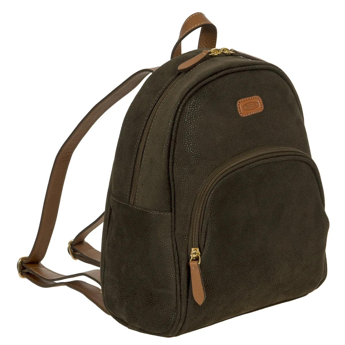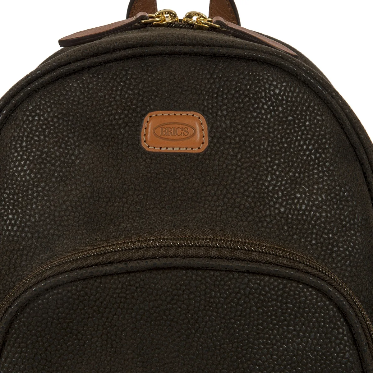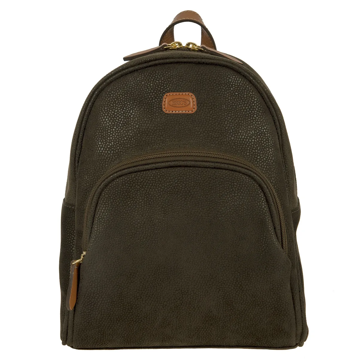 Aus Bric’s Material in Wildlederoptik mit Details aus pflanzlich gegerbtem Toskana-Leder, ausgestattet mit einer Fronttasche mit Reißverschluss, regulierbaren Schulterriemen und einem Lederhenkel. Im Inneren befindet sich eine zweite Tasche mit Reißverschluss.