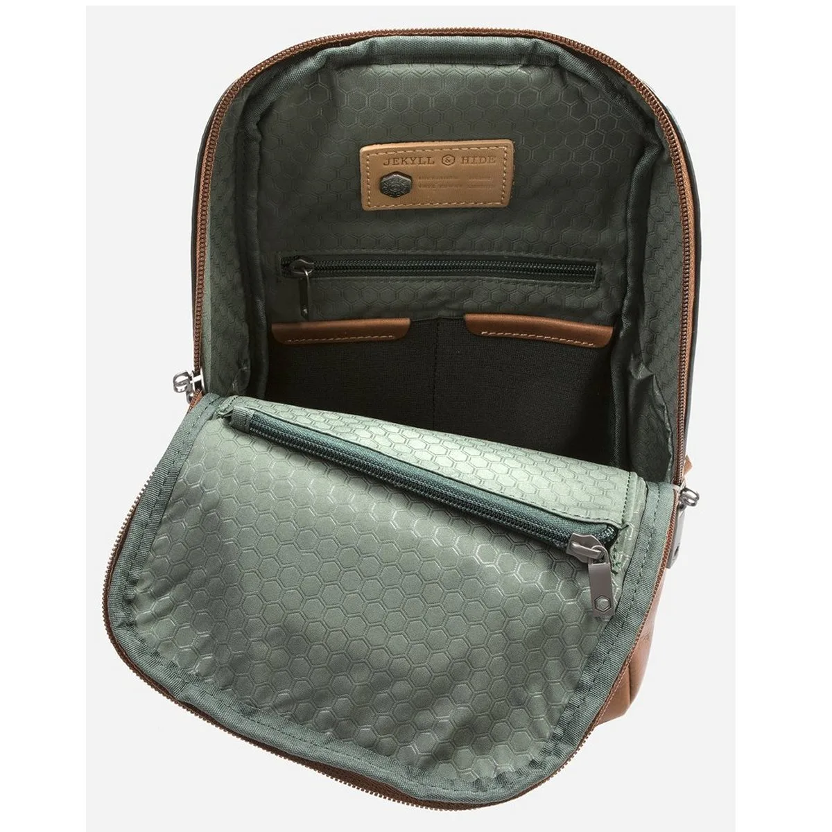 Reißverschlussfach vorne, sicheres Reißverschlussfach auf der Rückseite. Hauptfach mit Reißverschluss. 100% recyceltes Innenfutter. Innenfach mit Reißverschluss und RFID-Schutz, 1 leicht zugängliches Reißverschlussfach, zwei Stretchfächer zur Aufbewahrung von technischen Geräten. Verstellbarer Schultergurt mit Metallschieber.