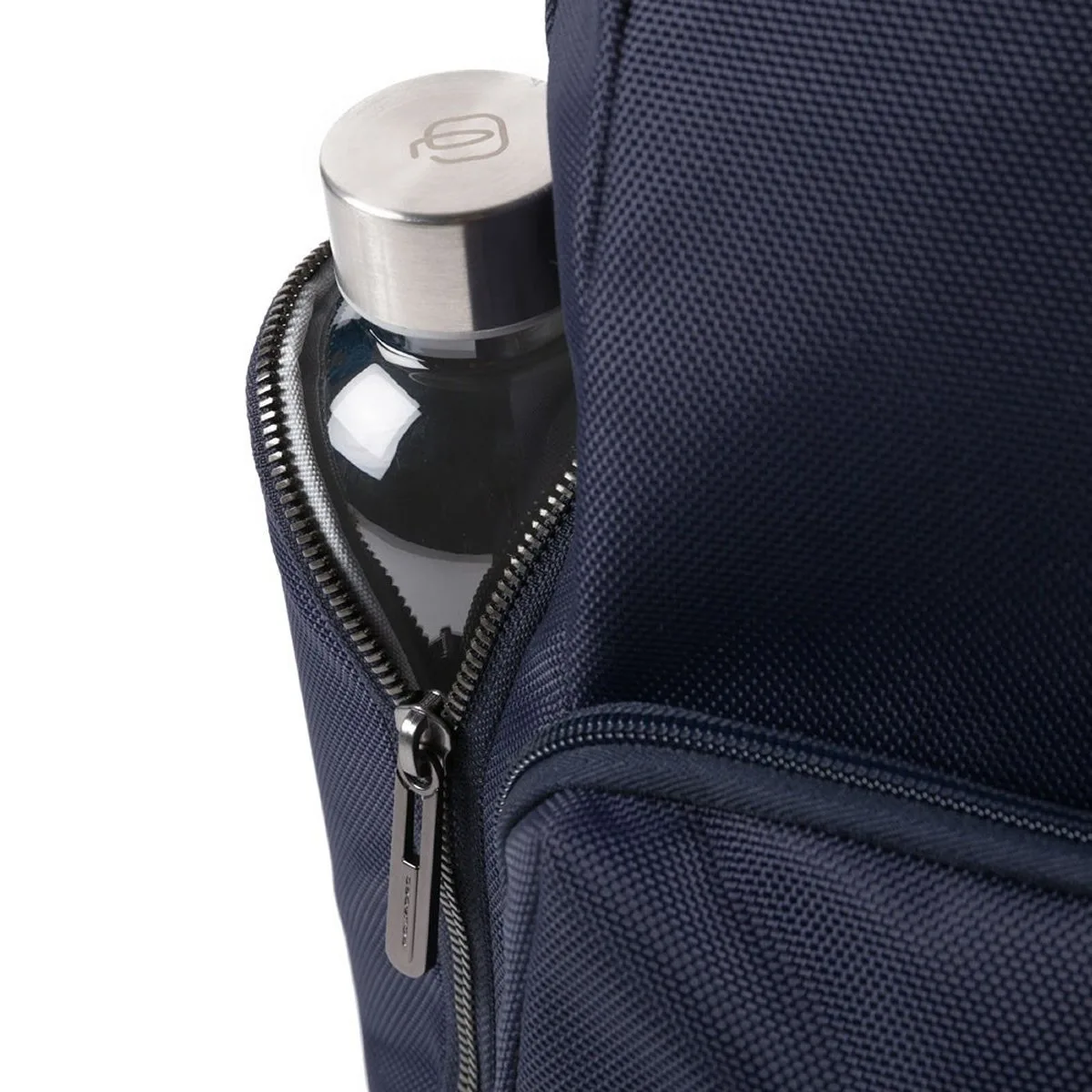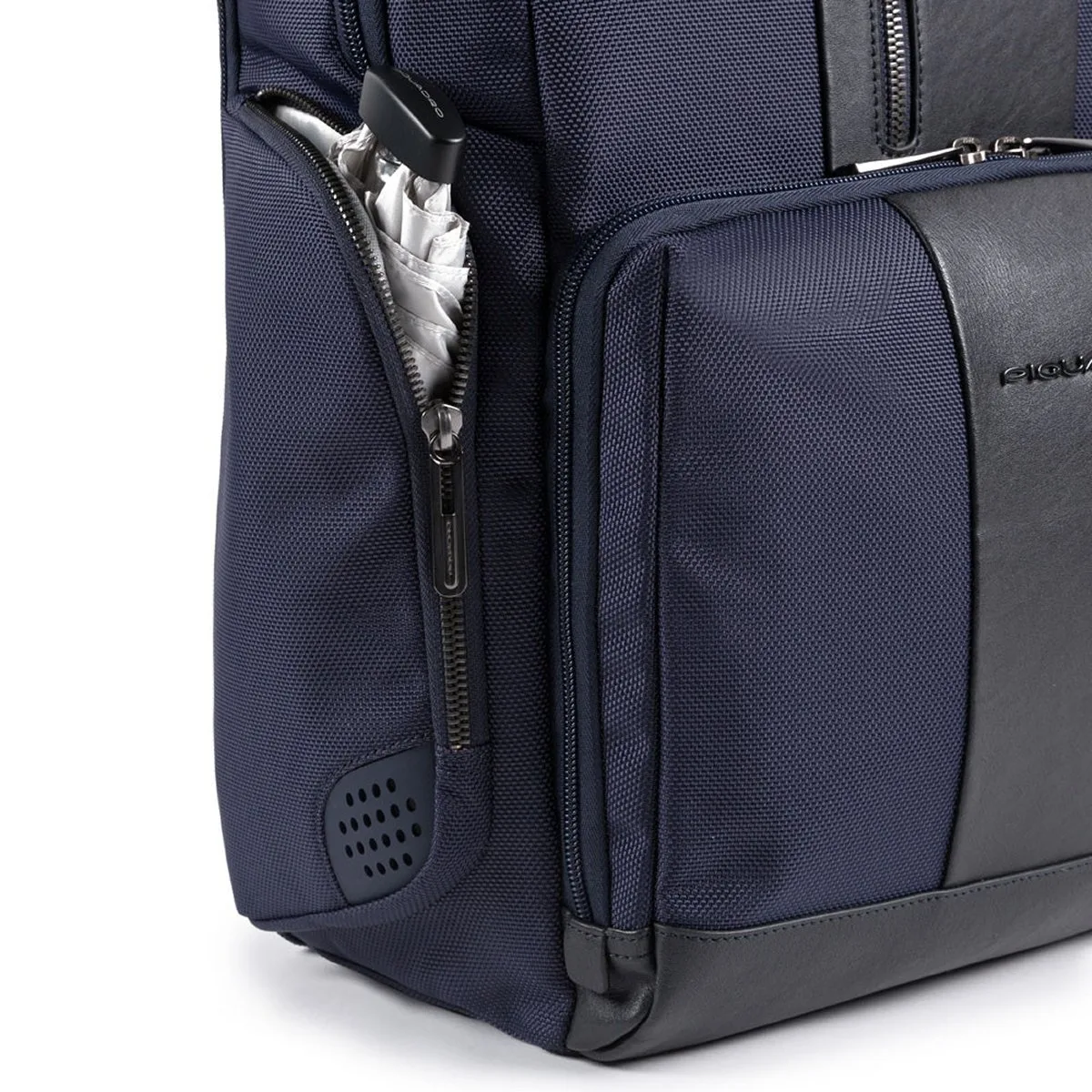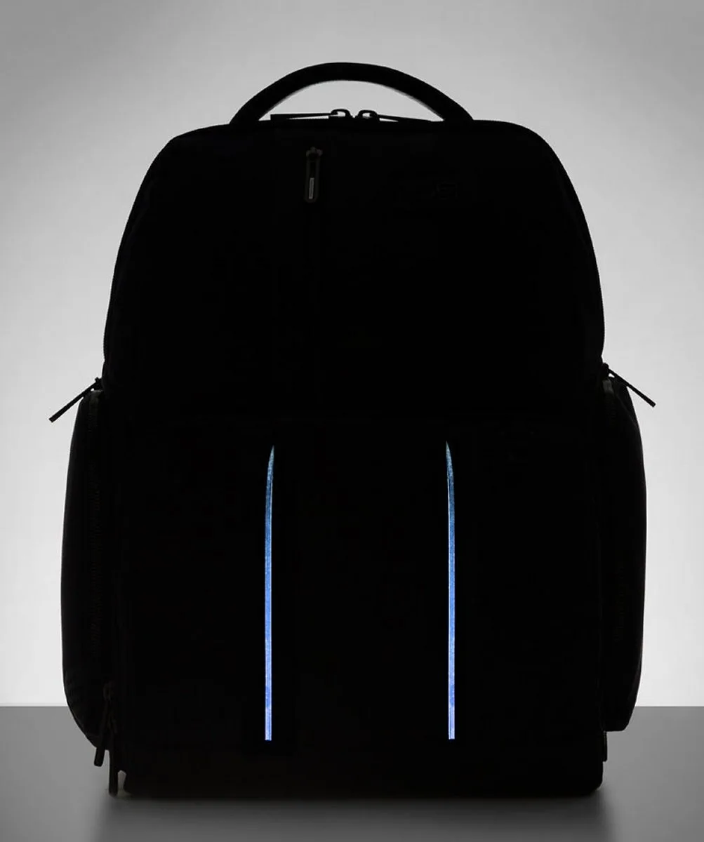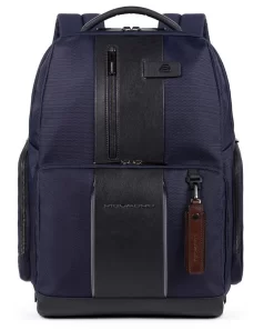 Fast-Check Laptoprucksack aus rezykliertem Stoff mit iPad®-Fach, LED Licht und RFID-Blocker. Fixe Innenaufteilung mit Schreibgeräthalter, Handy Innentasche, Fach für iPad®Air-iPad®Pro 9.7/iPad 11″. Fixer Handgriff, gepolstertes Notebook-Fach (15.6″). Trolley-Einhaksystem, aus Nylon mit Echtleder Details.