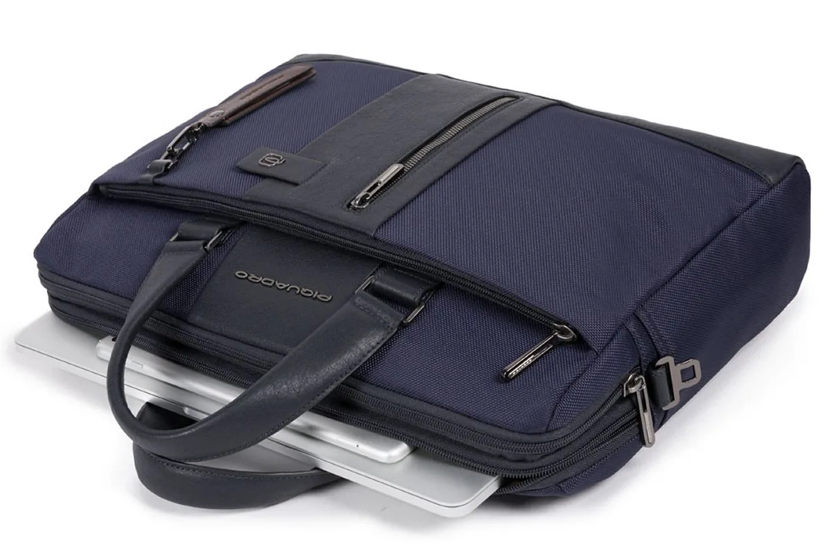 Schmale Kurzgrifflaptoptasche aus rezykliertem Stoff mit fixer Innenaufteilung für Schreibgeräte, IPAD®AIR-IPAD®PRO 9.7/IPAD 11″, einem gepolsterten Notebookfach 15.6″. Trolley-einhaksystem mit Banverschluss, Reissverschluss und abnehmbarer Schulterriemen runden diese Tasche ab.
