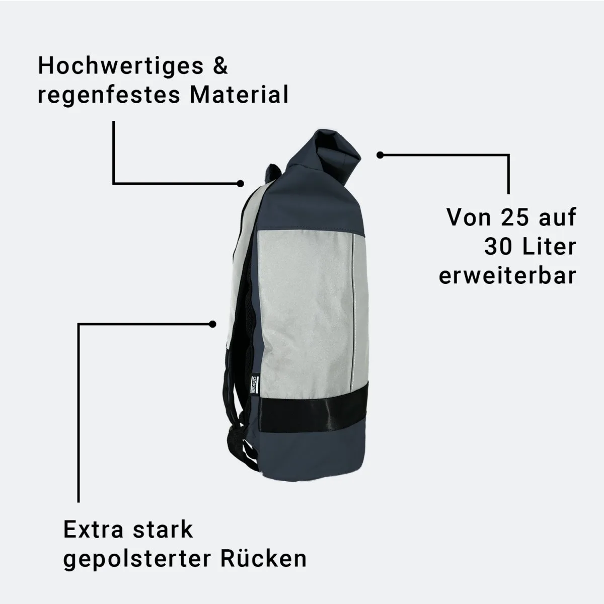Wasserabweisendes, langlebiges Material und ein stark gepolstertes Laptopfach (15″), machen diesen Rolltop-Rucksack zu einem zuverlässigen Begleiter. Die weiteren Vorteile: Hochwertige voll reflektierende Oberfläche, dank rolltop-System von 25 auf 30 Liter Füllmenge erweiterbar, ergonomisches & atmungsaktives Trägersystem mit extra gepolstertem Rücken. Masse Laptopfach: 26 (B) x 2 (T) x 41 (H) cm