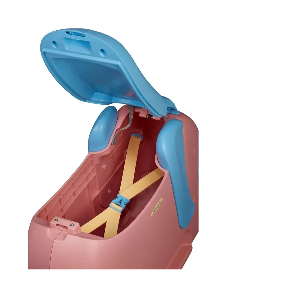 Unterhaltung für die Kleinen und Entlastung für die Grossen! Die Deluxe Variante bietet praktische und schön gestaltete Details wie zum Beispiel eine integrierte Fuss-Stütze oder Elefantenohr-Griffe. Das Reisen wird für Kinder zum spannenden Abenteuer, denn der Koffer kann auch als fahrbarer Untersatz benutzt werden. Robuste Polypropylen Schale, vier Rollen, Tragegriff an der Oberseite und abnehmbarer Schulterriemen.