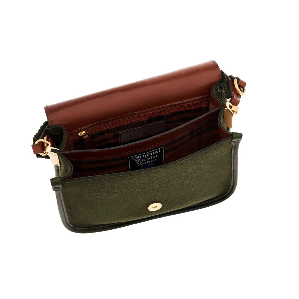 Diese elegante Umhängetasche aus echtem Tiroler Loden von The Bridge wird mit Überschlagklappe und Magnet geschlossen. Zwei gefütterte Innenfächer und ein verstellbarer Schulterriemen runden die zeitlos elegante Tasche ab.