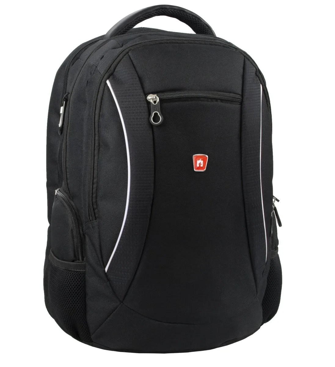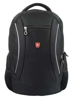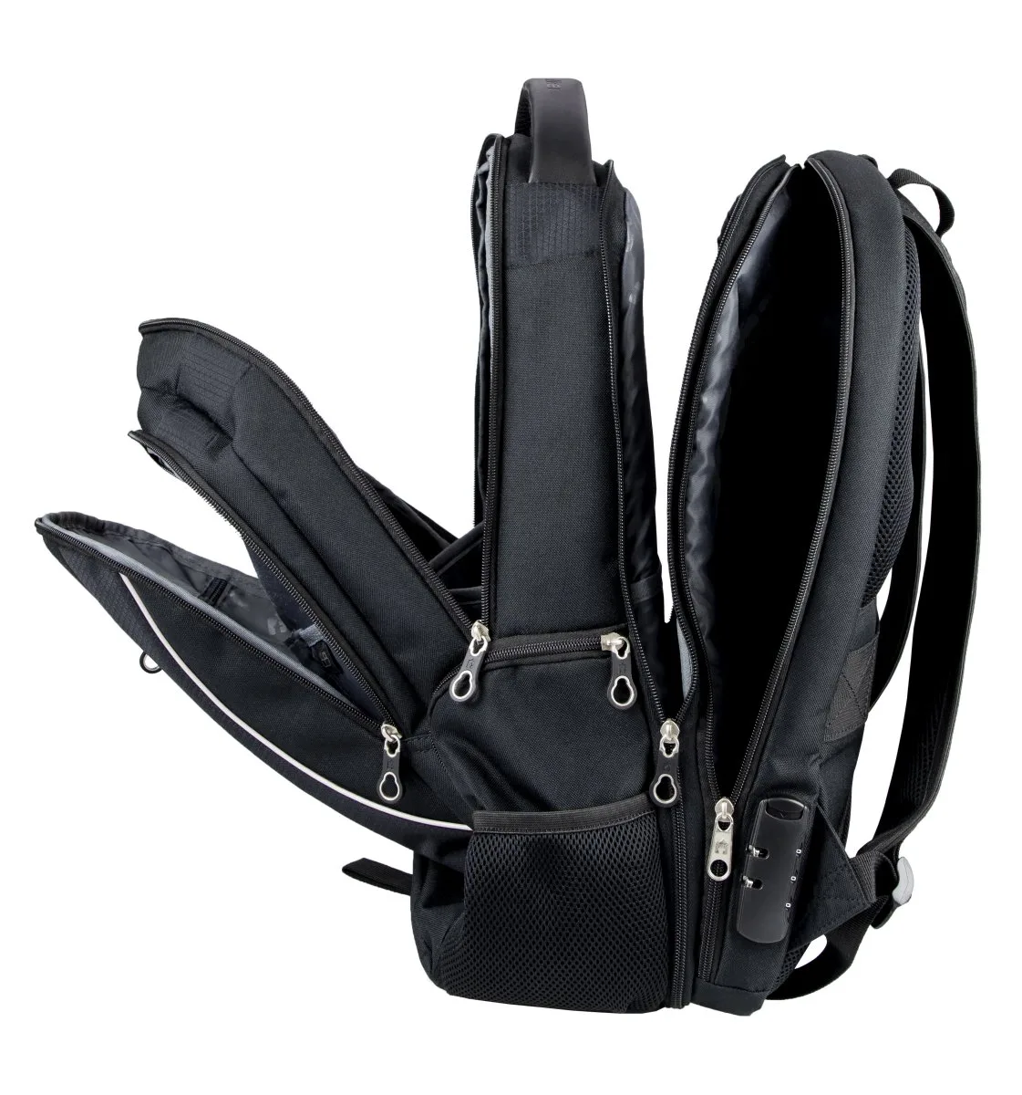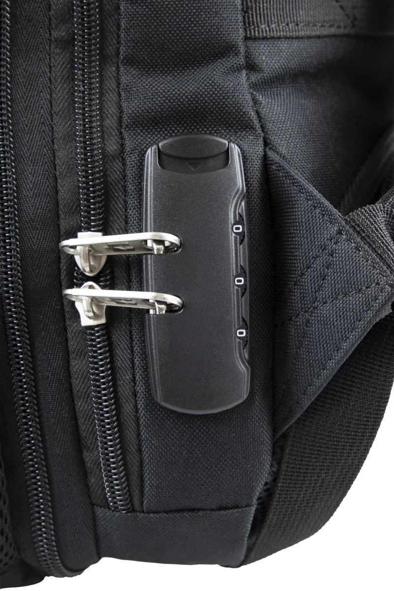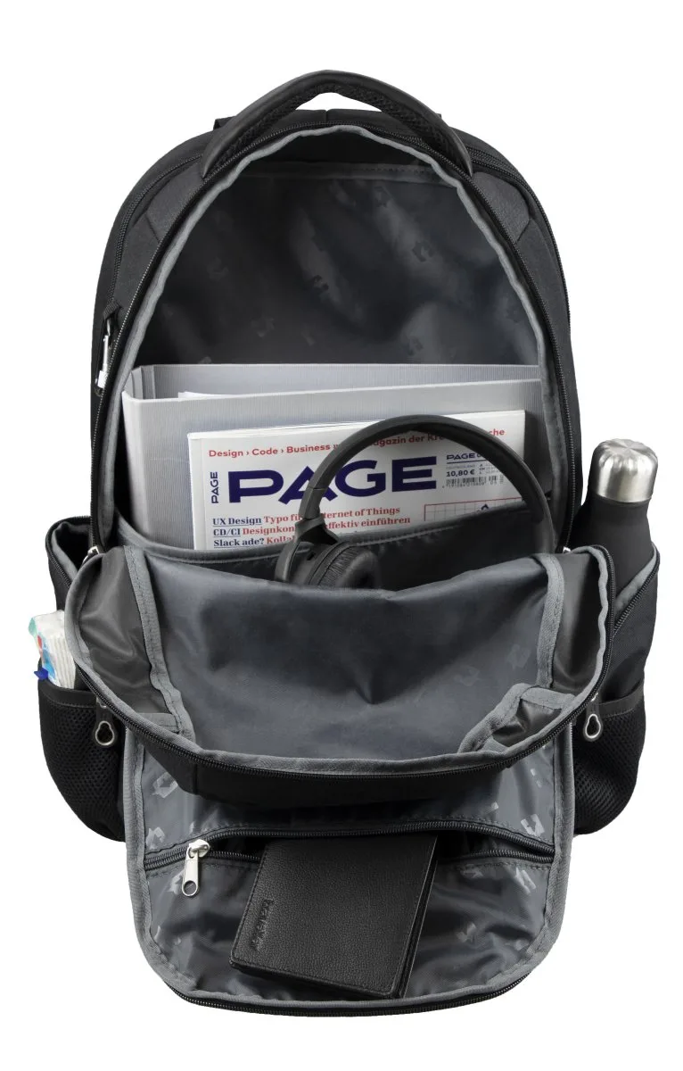 Der ideale Rucksack für Reisen mit Flugzeug oder Zug, denn er erleichtert und verkürzt die Sicherheitskontrolle durch sein 180° aufklappbares 17 Zoll Laptopfach, mit integriertem Zahlenschloss. Der schwarz-graue Rucksack verfügt außerdem über ein Organizer-Fach, ein großes Hauptfach sowie ein kleineres Frontfach. Zwei Seitentaschen mit Reißverschluss und jeweils eine aufgesetzte Netztasche mit elastischem Band komplettieren die Aufteilung. Zur leichteren Handhabung und mehr Komfort dient ein Trolley-Fix Gurt und gepolsterte Tragegriffe.